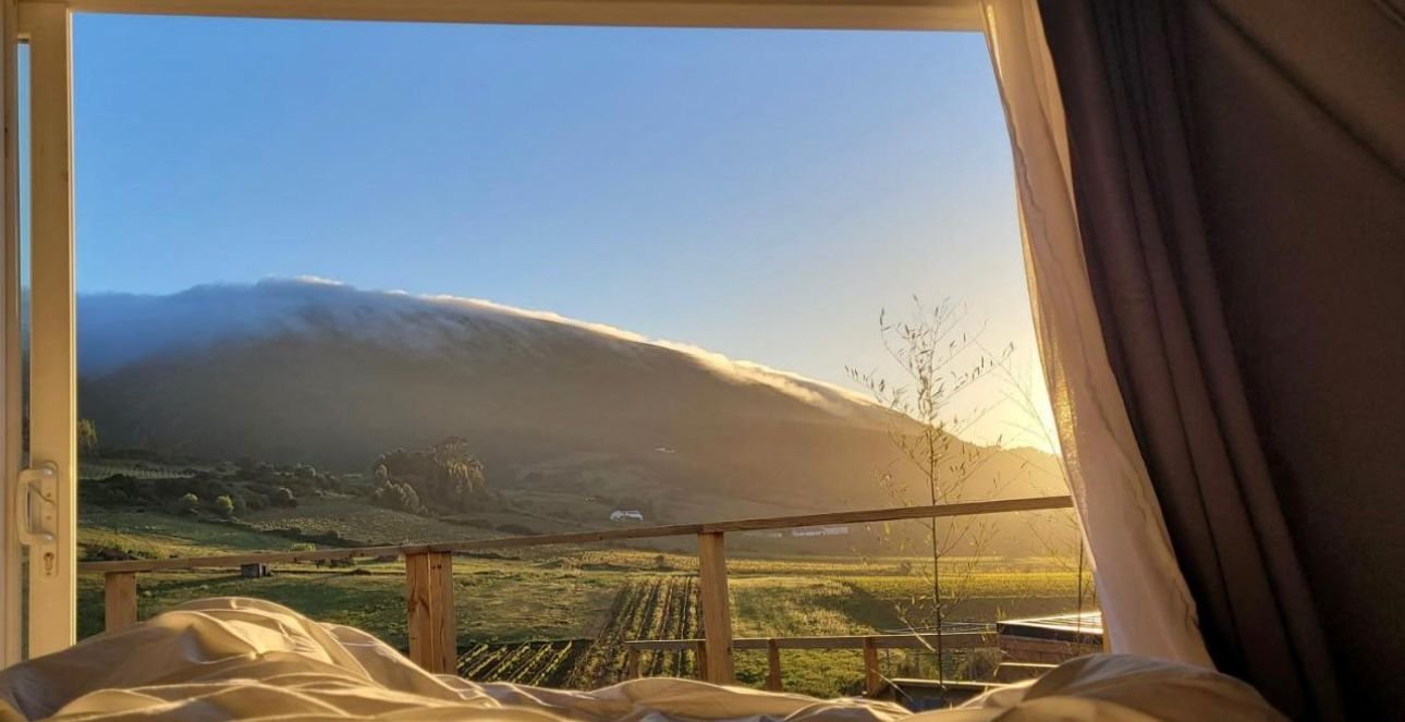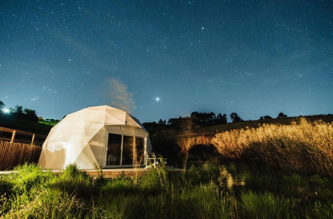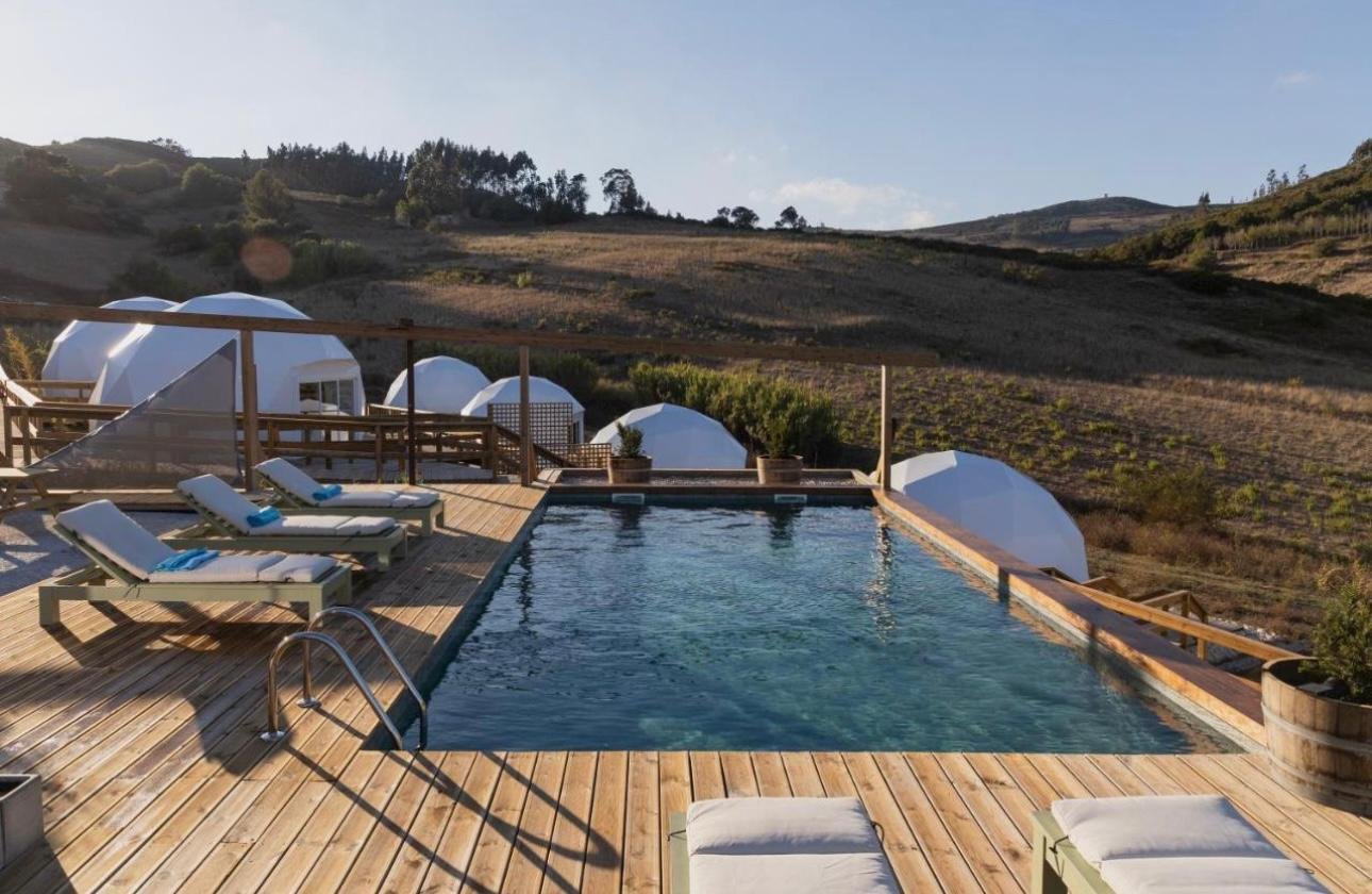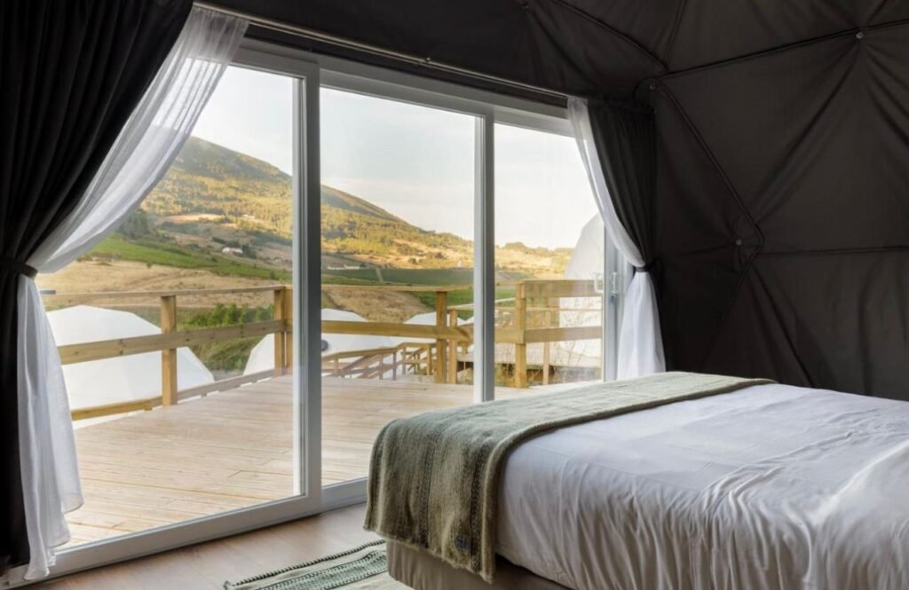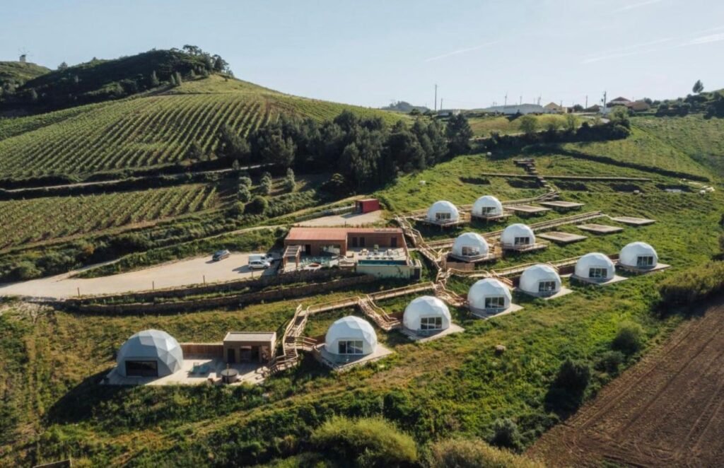 Os domos estão espalhados pela encosta, com espaço suficiente entre eles para garantir privacidade e aquela sensação de isolamento bom — aquele que não pesa, mas acalma.